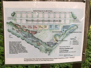 Signage at the peony bed entrance describing their history and plans for expanding the peony gardens and the nearby Laurel Ridge. - Erin Fedeson